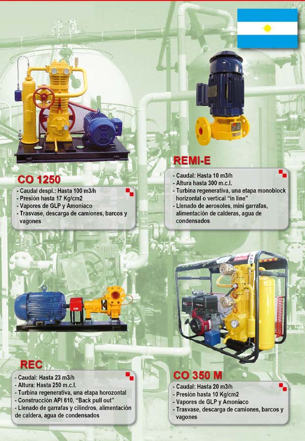 Queremos destacar que los mismos, fueron especialmente diseñados para su aplicación en el bombeo de G.L.P. (Gas Licuado de Petróleo), respondiendo a las normas de seguridad y construcción API 610, garantizando la intercambiabilidad de todos sus elementos y curvas de rendimiento obtenidas mediante pruebas en nuestro Banco de Ensayos.